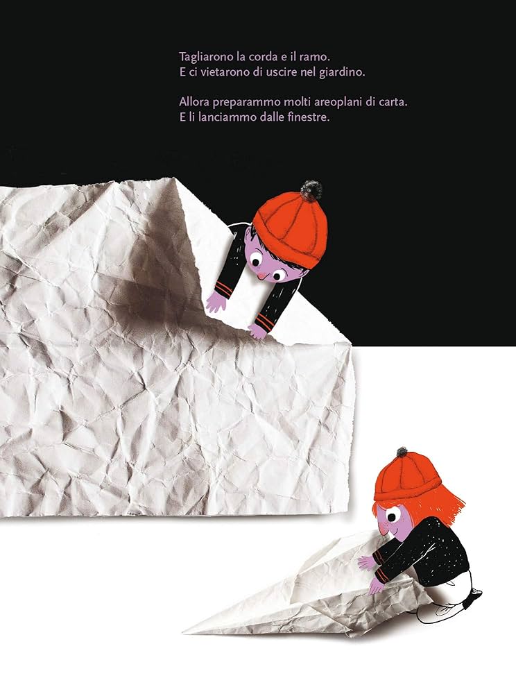 I bambini disegnati da Marianna Balducci, sono sagomine in bianco, nero e rosso. Anche per i fondi e le ambientazioni vengono usate queste tinte. Scopriamo che soli tre colori (con i loro sotto toni e tutte le sfumature che ne derivano), non solo bastano a dare profondità alla pagina, ma rendono le immagini efficaci e nette. I personaggi alle volte “saltano” fuori da un foglio bianco stropicciato, prendono vita e ci vengono incontro. E anche il muro, e tutto quel che succede al di qua o al di là, così rappresentato, sembra possibile e fa meno paura.