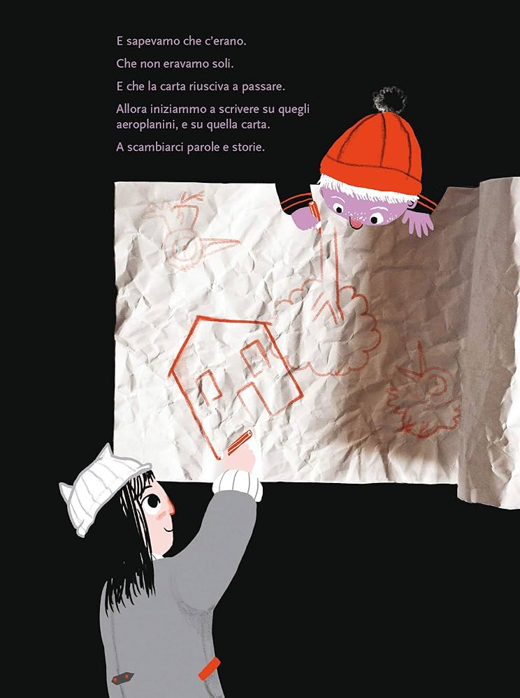 I bambini, al di qua del muro, provano in tanti modi a comunicare con i loro coetanei che sono dall’altra parte e che non hanno ancora incontrato mai. S’inventano di tutto. Ci provano gonfiando dei palloncini con l’elio, così che volino in alto e possano essere visti. Ci provano con dei lunghi bastoni, più alti del muro, alla fine dei quali infilano i loro berretti. Fanno anche volare degli aquiloni, e degli aeroplanini di carta perché arrivino da loro…